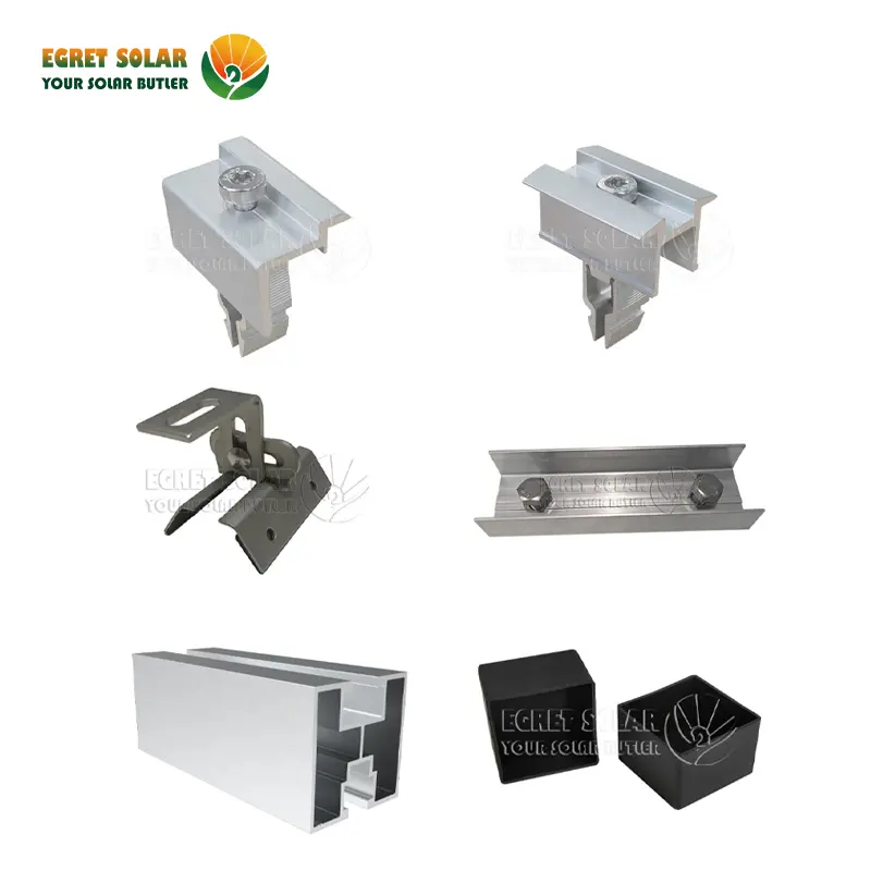 Sistema mota hau, batez ere, eguzki x clamp, aluminiozko profila 40x40mm, bukaera bizkorreko pinza, Mid Mid Mid & Rail konektorea dira. Trenbidearen luzera trenbidearekin luzatu daiteke. Eguzki metalezko teilatu sistema guztiz egokia babesteko, amaierako txanoa gehi dezakezu.