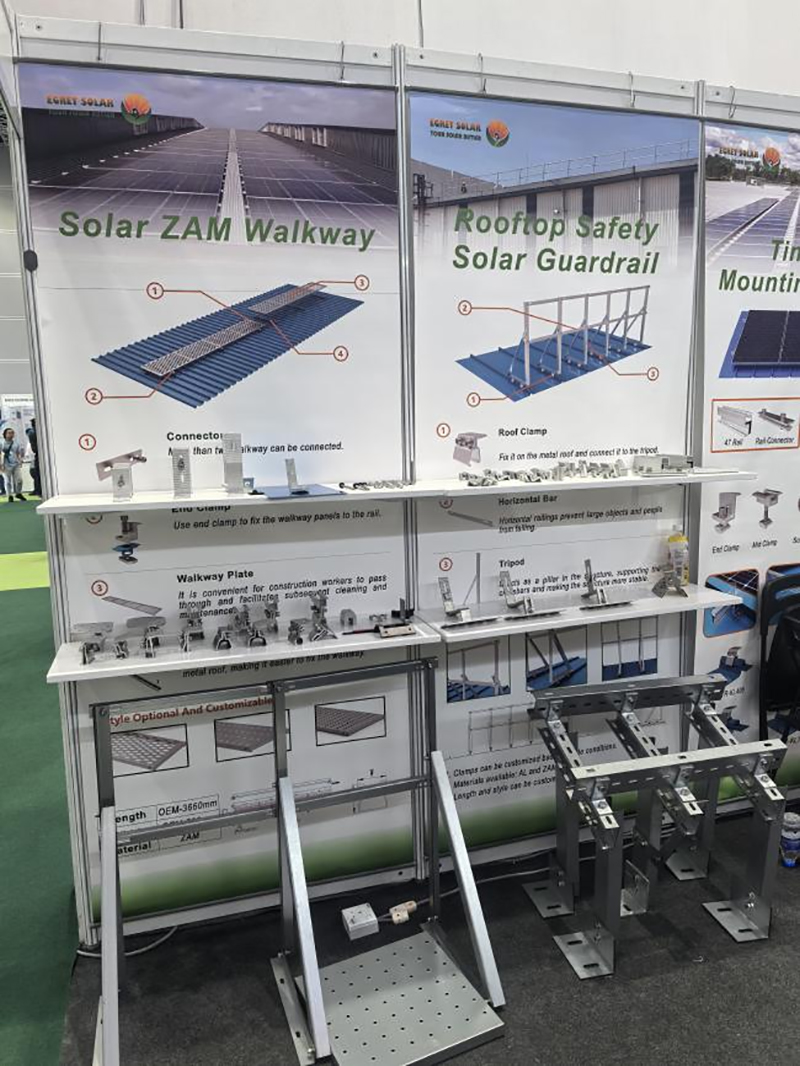 Erakusketan, teilatuko hainbat osagarri erakutsi genituen, besteak beste, besarkadak, kakoak eta L oinak. Bezeroek konbinazio desberdinak aukera ditzakete beren instalazio-ingurunearen arabera. Besarkadak edo L oinak kolorez estalitako altzairuzko teiletarako erabiltzen dira, teilatuko teila-kakoa eguzki-teiletarako zeramikazko teiletarako. Bezeroaren kolorez estalitako altzairuzko baldosaren ereduan oinarritutako besarkadak ere pertsonaliza ditzakegu edo kakoaren besoa zabaldu, tokiko erabilera egokitzeko.