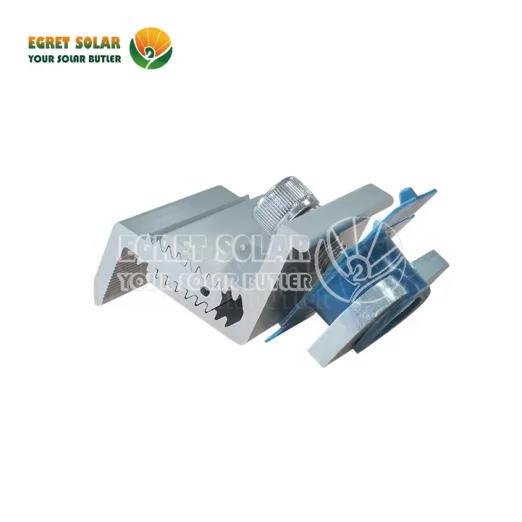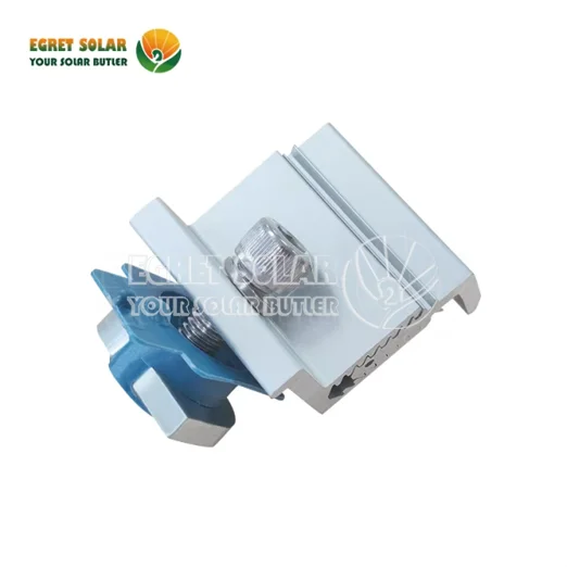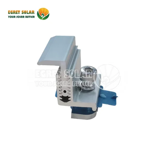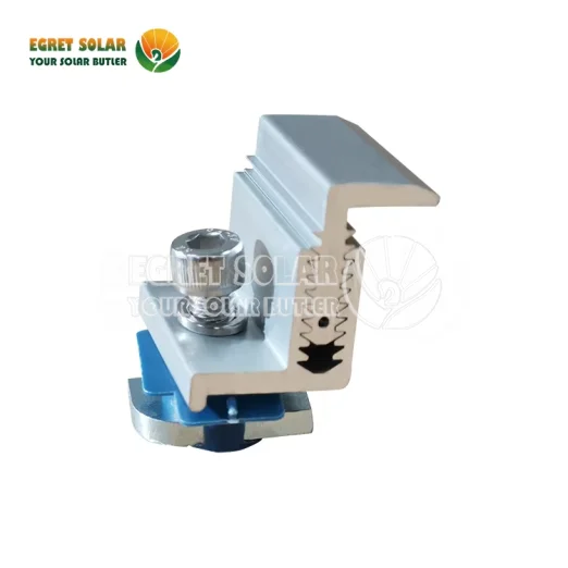 Egret Eguzki Panelaren amaierako clamp Erregulagarria C altzairuzko trenbidearentzat eguzki plaken muturretan erabiltzen dira, haize-errailak haize altuetan edo elur karga handietan altxatzea ekiditeko. Eguzki panelak eraikitzeko eguzki panelak lortzeko ere erabiltzen dira eguzki panelaren muturretan. Amaierako clamp estutu esku batekin konexio sinple eta segurua lortzeko kableak loturak plateretan zirrikitu baten bidez tiraka.